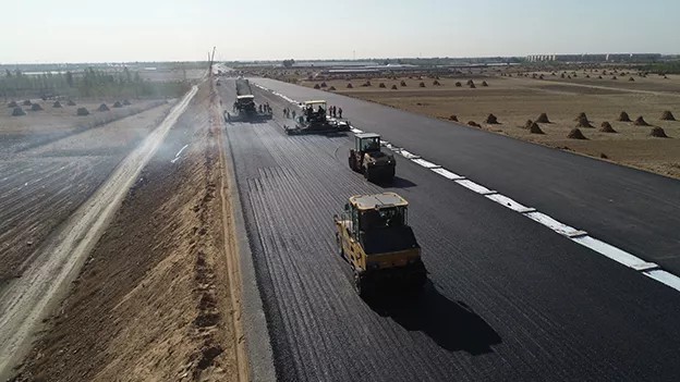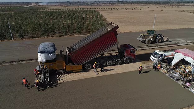 沥青路面摊铺机均匀直线慢速行驶,采取两台摊铺机梯队作业,采取热接缝工艺,严格控制沥青混合料的摊铺温度,摊铺过程中随时检查高程和厚度,并及时反馈操作手予以微调。按照试验段确定的压实机具及组合方式,匀速前进,按照初压、复压、终压三个阶段进行,初压不少于2遍,整平和稳定混合料,复压4-6遍使混合料密实、稳定、成型,终压2遍以上消除轮遍迹,最后形成平整、密实的沥青路面。